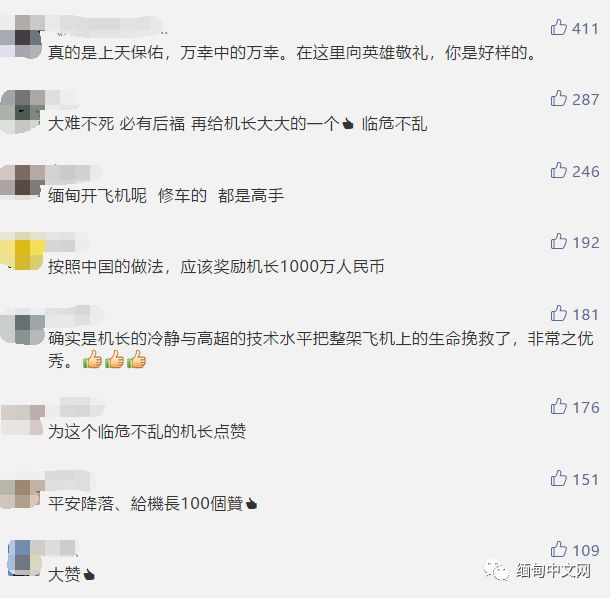 缅甸国家航空公司当天发表了声明,表扬了遇事沉着冷静的机组人员及没有出现慌乱现象的乘客们。采取果断措施,紧急迫降的机长名叫Myat Moe Aung,航空公司还表扬了齐心展开合作的副机长高塞林和迪哈昂,以及乘务员玛澈瑞敏、玛格甲散昂、玛凯撒林、玛欧玛昂等人。