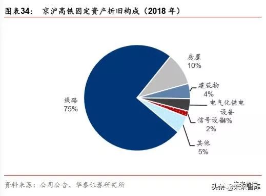 京沪高铁折旧主要来自:线路(75%)、房屋及建筑物(14%)、供电和信号设备(6%) (2018 年)。由于动车组产权不在公司,京沪高铁不计提动车组折旧,而是每年支付动车组使用 费,相当于长期的融资租赁。我们将京沪高铁的折旧与动车组使用费视为整体,绘制各项 目的构成比例。横向比较观察,广深铁路和大秦铁路建造时间较早,线路折旧费用的占比 较低,车辆折旧费用占比较高。