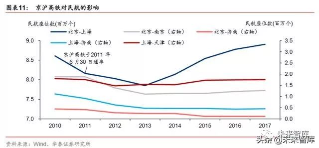 京沪高铁对许多航线产生过重大影响。京沪高铁沿线的重要空港枢纽为北京、天津、济南、 南京、上海,重要航线为北京-上海、北京-南京、北京-济南、上海-济南、上海-天津。受 京沪高铁 2011 年 6 月 30 日通车的影响,上述 5 条航线的座位数在 2011-2013 年显著降 低。从 2014 年起,长距离航线恢复自然增长,如北京-上海(1075 公里)、上海-天津(951 公里)、北京-南京(948 公里);但短距离航线持续萎缩,如北京-济南(362 公里);中等 距离航线上海-济南(734 公里)则保持平稳。