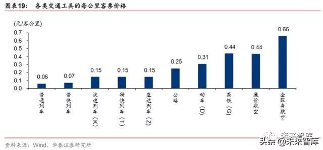 时速 160 公里复兴号动车组逐步替换普速列车,客票价格相应上涨。2019 年,时速 160 公里的复兴号动车组投入运营,与普速列车共用相同线路,但复兴号执行动车组票价,远 高于普客票价。动车组(D)的单公里票价约为常见普客列车(K/T/Z)票价的 2 倍。未来 随着复兴号替代普速列车,整体客票均价可能逐步上涨。