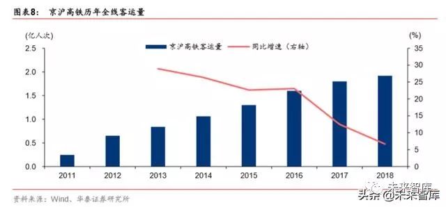 京沪高铁在 2011 年开通以来,客运量快速增长。2013-2016 年,客运量同比增速处于 20%-30%区间。2017-2018 年,因基数提高,客运量增速逐步放缓,客运量同比增速降 低至 5%-15%区间。