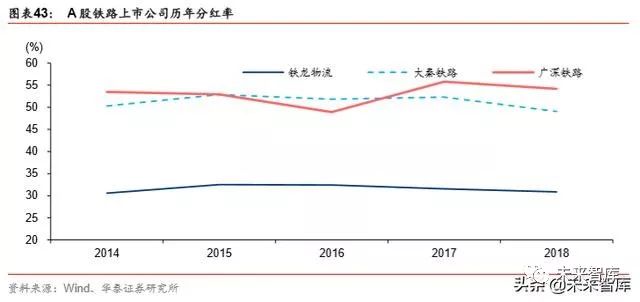京沪高铁承诺分红率达到 50%。根据《上市后三年股东分红回报规划》,京沪高铁在招股 说明书中承诺,公司每年以现金形式分配的利润为该年度归母净利润的 50%。京沪高铁公 司在 2016、 2017 和 2018 年度的分红率为 50%、 50%、 70%。过去 5 年( 2014-2018 年), 大秦铁路和广深铁路的分红率均值约 51.3%、53.1%,铁龙物流为 31.6%。京沪高铁资产 负债率较低(2019 年 9 月底,14.6%),折旧占营业成本的比重较高(2019 年前三季度, 19%),现金流充沛。