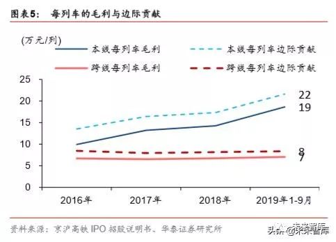 本线车的边际回报高于跨线车。以京沪高铁为例,2019 年前三季度,本线车的毛利约 19 万元/列,跨线车的毛利约 7 万元/列。我们用毛利加折旧来拟合边际贡献。2019 年前三季 度,本线车的边际贡献约 22 万元/列,跨线车的边际贡献约 8 万元/列。以前三季度数据折 合全年测算,若每日开行多 1 对本线车,公司将增加 1.58 亿元毛利;若每日开行多 1 对 跨线车,公司将增加 0.61 亿元毛利。每列本线车的回报约为跨线车的 2.6 倍,这与二者 的单公里回报率以及运距差异相关。